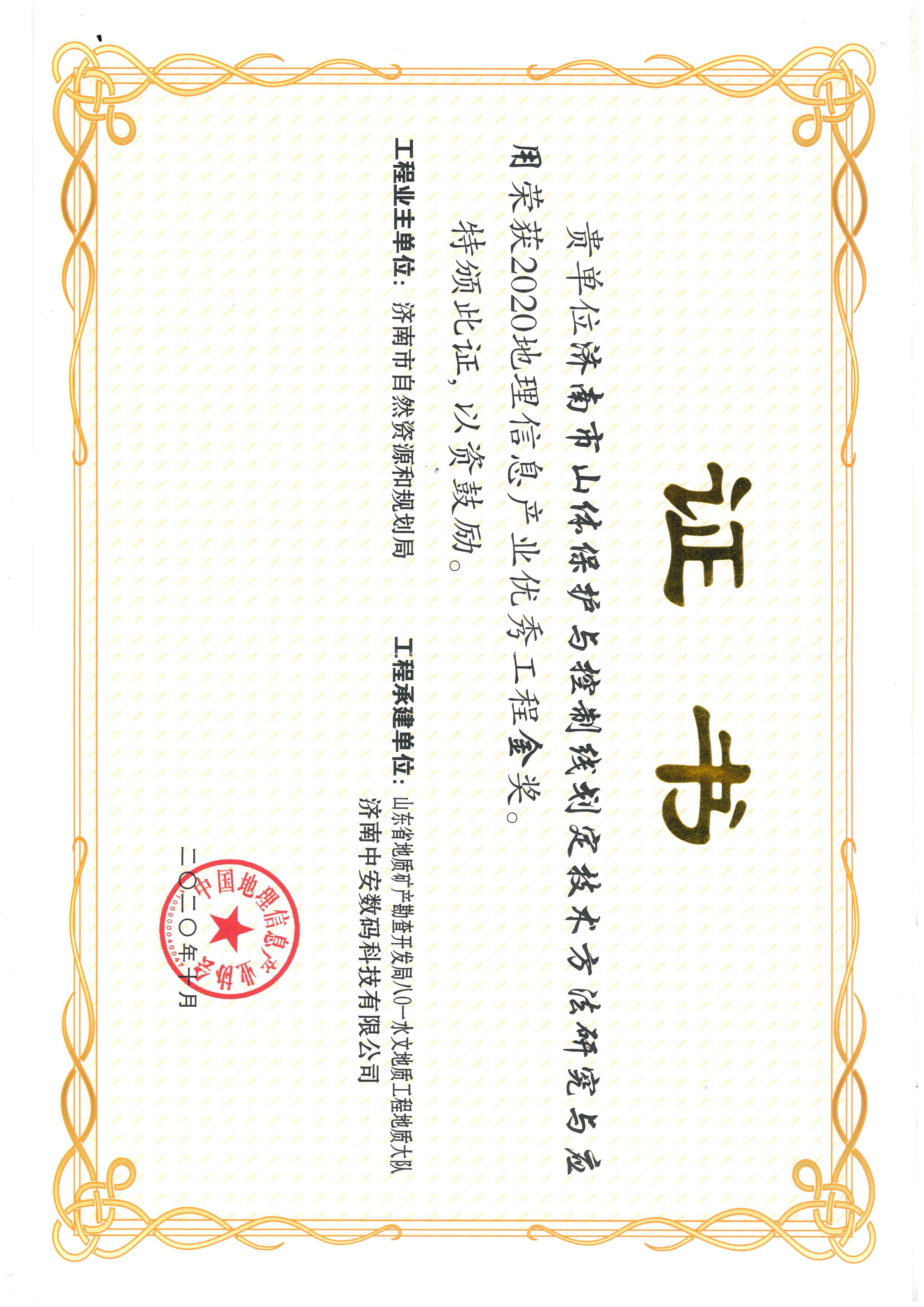 2020年優(yōu)秀工程金獎(jiǎng) 地理信息科技進(jìn)步獎(jiǎng)證書